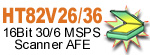HT82V26 拥有三个信道结构,可提供一个,两个或三个信道的操作模式供使用者选择,而且可任意搭配 CCD或CIS感应器输入,应用范围可说是相当广泛。16 bits高分辨率的设计,使得HT82V26可运用在负片扫描仪及其它高阶扫描仪产品上。HT82V36则只拥有一个通道的输入,也可选择搭配CCD或是 CIS感应器。内部ADC转换速度最大可达6MHz。速度虽无HT82V26来得快,但在低功率扫瞄器应用上已经绰绰有余。同样采用16 bits高分辨率设计,符合目前扫瞄器AFE的趋势。另外,HT82V26和 HT82V36皆采用28pin SSOP的封装。